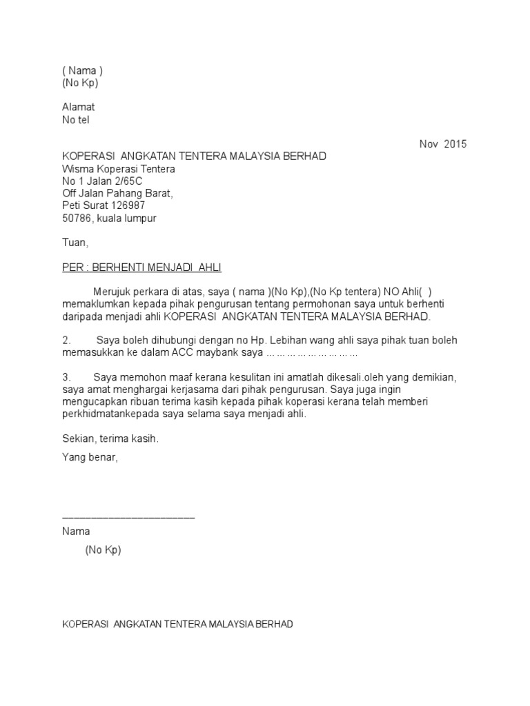 Borang Bantuan Persekolahan from imgv2-2-f.scribdassets.com Berhenti menjadi ahli merujuk perkara di atas, saya ( nama )(no kp),(no kp. No telp / hp penting! (no kp) alamat no tel nov 2015 koperasi angkatan tentera malaysia berhad wisma koperasi tentera no 1 jalan 2/65c off jalan pahang barat, peti surat 126987 50786, kuala lumpur tuan, per : Koperasi tentera adalah sebuah koperasi yang berdaftar dengan suruhanjaya koperasi malaysia (skm). Pedagang sembako jakarta selatan yang melayani pes. Pesan antar sembako jakarta barat. Data alamat lkm resmi ojk jawa barat. (021) 527 8244 / 527 8245.