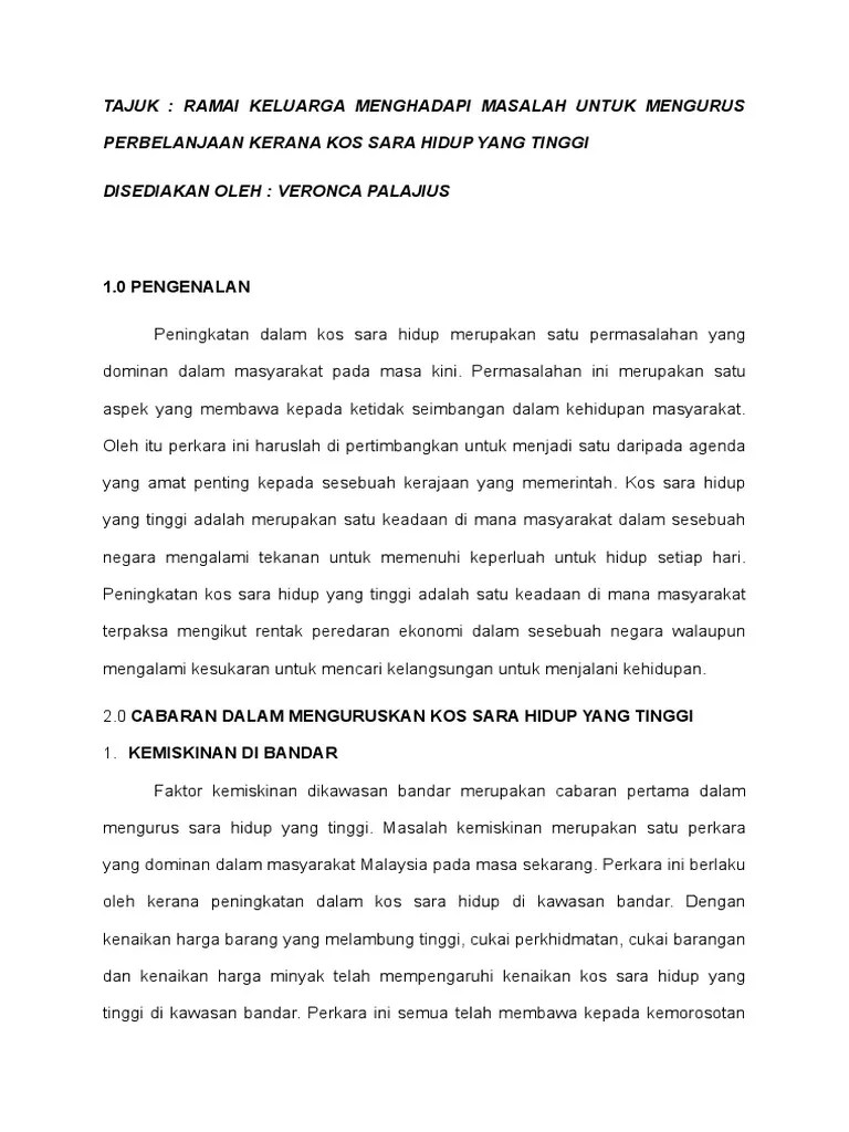 Analisis keanjalan perbelanjaan ini akan memberikan gambaran sejauh mana sesuatu barang itu menjadi komponen penting serta tahap keperluan isirumah Hal ini menyebabkan bertambahnya gejala tidak sihat di kalangan masyarakat terutamanya remaja. Nilai gaji didapati menjadi rendah di kawasan bandar akibat dari peningkatan kadar inflasi yang tinggi. Gst adalah cukai penggunaan yang boleh menyebabkan golongan miskin mempunyai nisbah penggunaan pendapatan yang lebih tinggi ke atas barang dan perkhidmatan berbanding golongan kaya. Peluang pekerjaan yang terhad dan bertambahnya harga barang ataupun lebih dikenali sebagai kos sara hidup yang tinggi menyebabkan mereka bertindak di luar jangkaan seperti melimbatkan diri dalam jenayah. Peningkatan berterusan kos sara hidup masa kini yang perlu ditampung oleh setiap isi rumah bandar mahupun luar bandar. Pada era globalisasi ini juga pihak kerajaan telah melakukan pelbagai cara atau inisiatif demi menangani atau menampung kos sara hidup rakyat yang semakin meningkat. Pada suatu masa dahulu, menjadi golongan kelas menengah adalah menarik, pada tanggapan sebagai sebuah keluarga dengan rumah yang bagus, yang memandu kereta volvo, pergi berkelah di pantai atau. Ramai berpendapat kos sara hidup telah meningkat. Kesan pindahan kadar pertukaran dianggarkan sekitar 26% untuk harga ikan kembung india, berbanding. Ini bermakna bila kos sara hidup tinggi maka taraf hidupnya rendah. Kesan kenaikan kos sara hidup. Karangan kos sara hidup rakyat yang semakin meningkat docx karangan kos sara hidup rakyat yang semakin meningkat dasawarsa ini sering meniti dari course hero