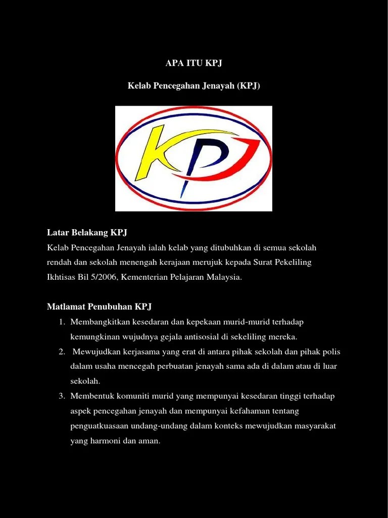 Melambangkan ahli kelab yang sentiasa prihatin terhadap perkembangan persekitaran secara berterusan. Kelab pencegahanjenayah latar belakang kpj kelab pencegahan jenayah ialah kelab yang ditubuhkan di semua sekolah rendah dan sekolah menengah kerajaan merujuk kepada surat pekeliling ikhtisas bil 5/2006, kementerian pelajaran malaysia. Mesyuarat agung kelab pencegahan jenayah. Berikut adalah maksud bagi logo kelab pencegahan jenayah: Akan mematuhi setiap peraturan dan disiplin sekolah.