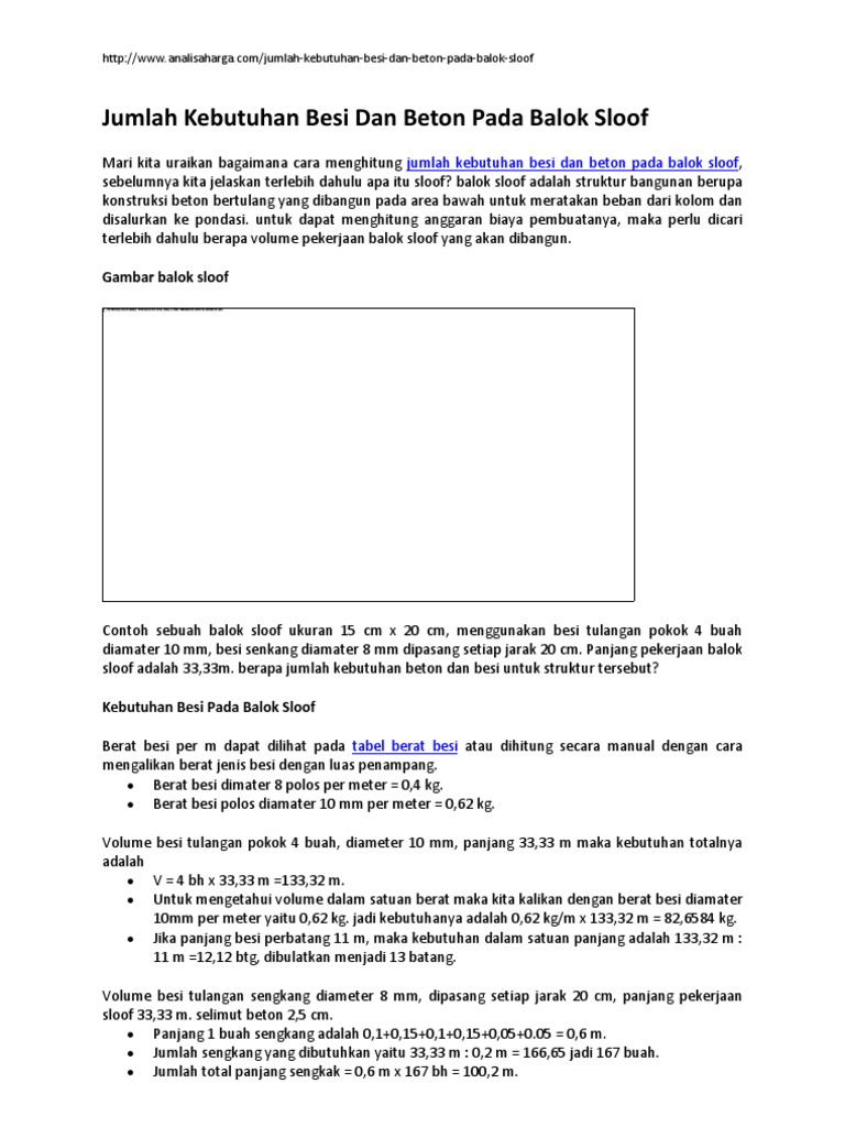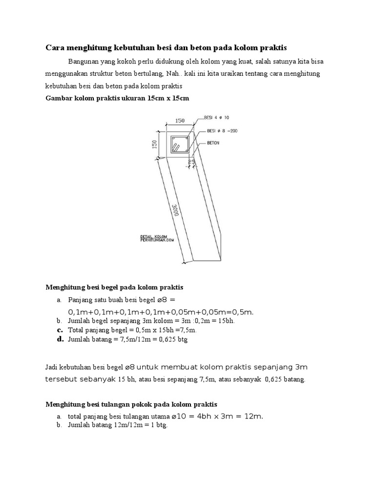 Untuk membangun rumah yang kokoh tentunya. Jadi kebutuhan besi begel ⌀8 untuk membuat kolom praktis sepanjang 3m tersebut menghitung besi tulangan pokok pada kolom praktis. Pada umumnya bata hebel berwarna putih yang digunakan sebagai material. Penjelasan mengenai cara menghitung kebutuhan beton jumlah material beton yang kita perlukan demikian salah satu cara perhitungan $olume besi4 untuk lebih mudahnya sekarang ini sudah etelah anda dapat menghitung $olume kebutuhan pasir4 semen4 dan kerikil pada sloo/. Kebutuhan besi untuk diameter bengkokan dan kait tulangan = 10cm, pada setiap ujung sloof.